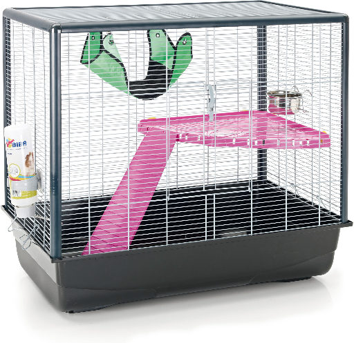 De zeer kleine spijlenafstand (9,5 mm) maakt de kooi niet alleen geschikt voor ratten maar ook voor hamsters. Het roze hoekplateau met dito ladder trekt meteen je aandacht. En de groene hangmat met donzig zwart pluche is een geweldige manier om te ontspannen.
