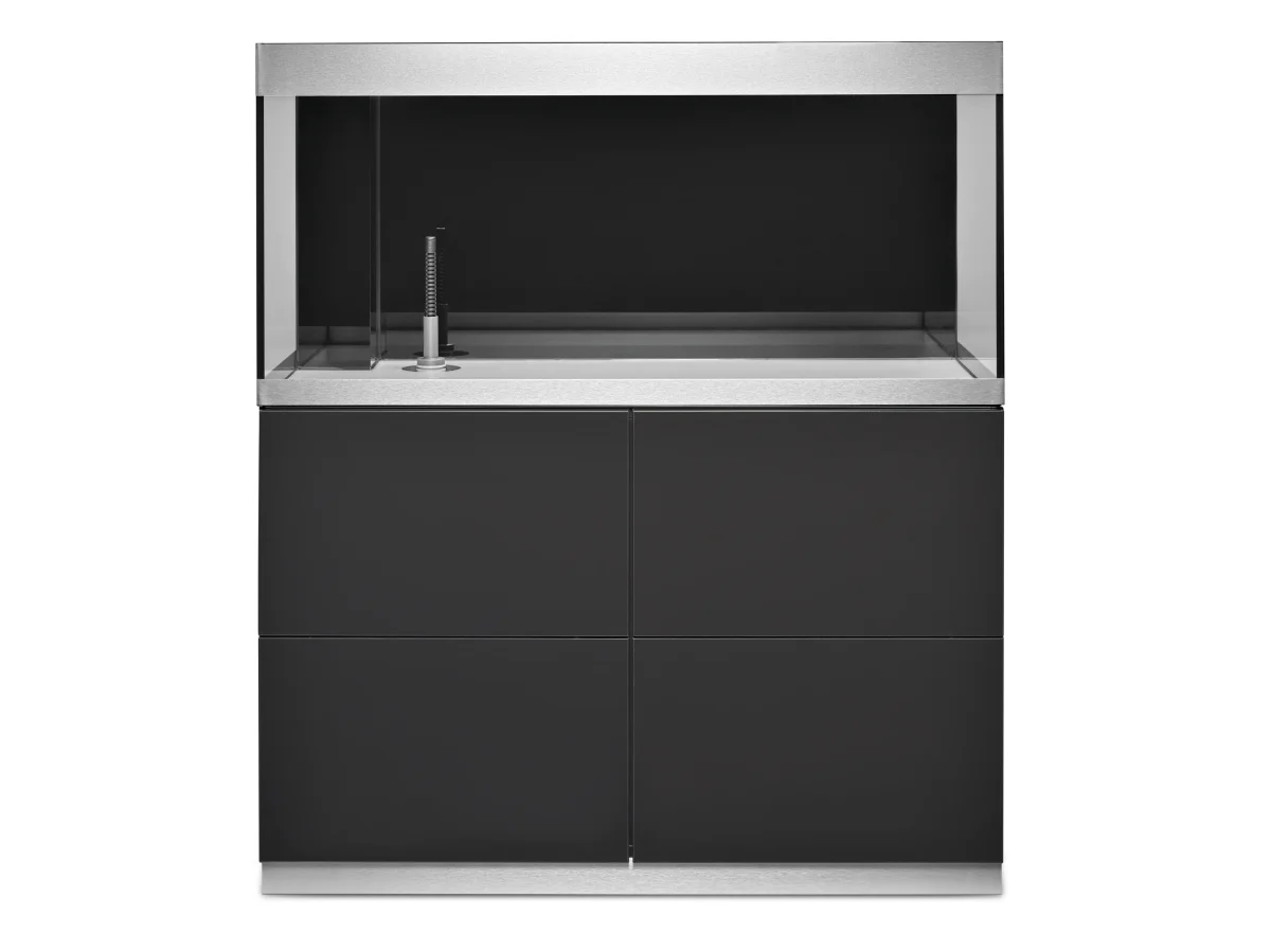 Geen overbodige details kunnen de aandacht afleiden van de prachtige onderwaterwereld in het aquarium: een slim geïntegreerde droge ruimte verbergt vervelende kabels en slangen, en handgrepen zijn niet nodig dankzij de druksloten op de deuren van de onderkast.