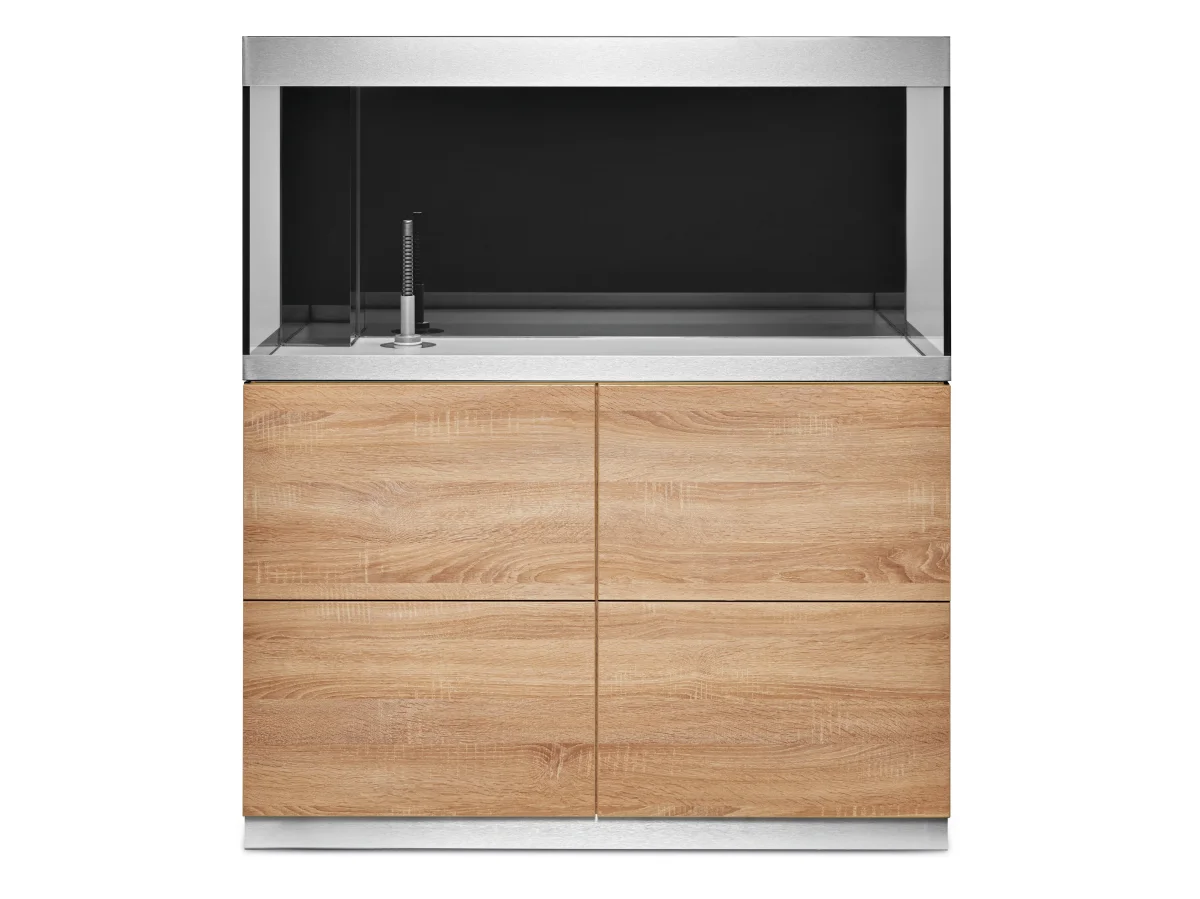 Er is een glazen opening in het aquarium voor toegang tot het optionele externe filter. De onderkast kan worden aangepast met lades of legplanken. Een uitschuifbare plank biedt plaats aan het externe filter en maakt het schoonmaken van het filter eenvoudiger.