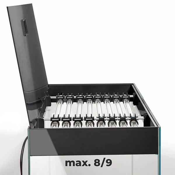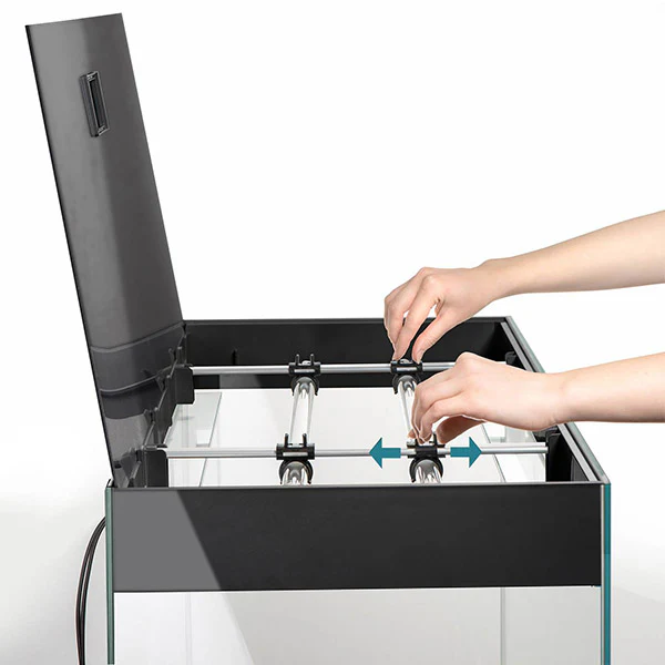 Le Glossy 80 est équipé d’une galerie d’éclairage LED amovible qui garantit le bon développement des plantes et l’aspect naturel de l’intérieur du bac. L’ensemble comprend deux tubes d’éclairage LED spéciales eau douce de 14W chacun, soit une puissance totale de 28W.