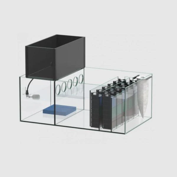 Le bac à décantation Sump FW (Fresh Water) pour aquarium d’eau douce comprend un réservoir d’eau, un ensemble de masses filtrantes, une mousse de support pour pompe afin d’atténuer considérablement les vibrations et un sac filtrant.