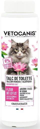 Vétocanis Droogshampoo (zonder spoelen) voor katten is een shampoo voor katten in de vorm van een poeder op basis van talk, bekend om zijn sterk absorberende vermogen met betrekking tot vet en vuil. Deze shampoo is ideaal voor katten omdat het geen water nodig heeft en je kat gemakkelijk een schone, zachte en licht geparfumeerde vacht geeft.