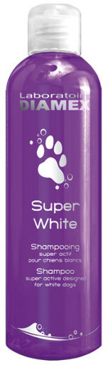 De Super White shampoo, van het merk Diamex, is een uiterst geconcentreerde shampoo voor honden (75 ml voor 1L verdund), verrijkt met zoete amandelolie, doet het wit glanzen, vermindert vergeling en maakt de vacht zijdezacht.