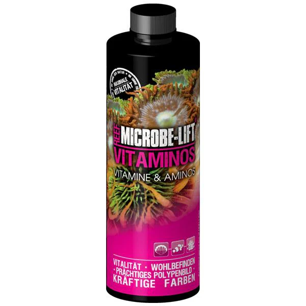 Reef Vitaminos MICROBE-LIFT assure un apport optimal en vitamines et acides aminés nécessaires et procure à tous les habitants de l’aquarium un maximum de bien-être et de vitalité.