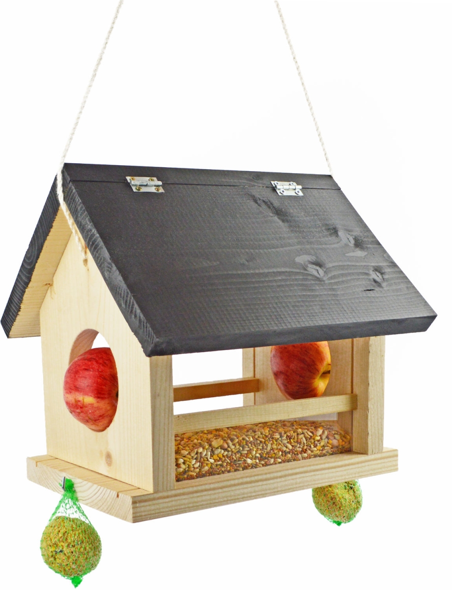 Het voederhuisje is voorzien van 2 gaten waar eenvoudig een appel aan kan worden opgehangen. Daarnaast is er een speciale houder voor vetbollen.