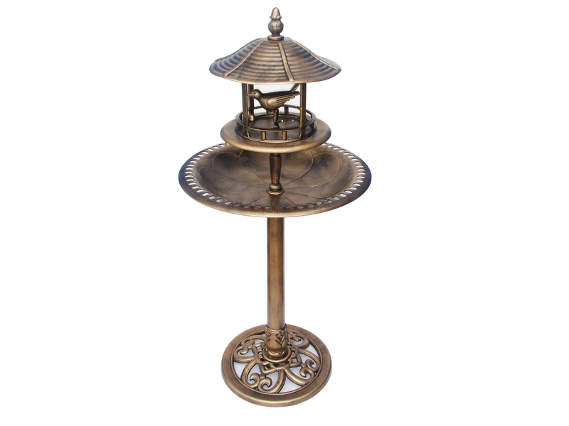 Een prachtige waterschaal en voederhuisje. Deze waterschaal is de ideale plaats voor tuinvogels die nood hebben aan water om te drinken of te baden.